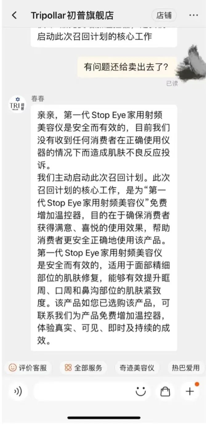 “第一代Stop Eye家用射频美容仪是安全而有效的,目前我们没有收到任何消费者在正确使用仪器的情况下而造成肌肤不良反应投诉。”初普天猫客服向消费者这样表示。