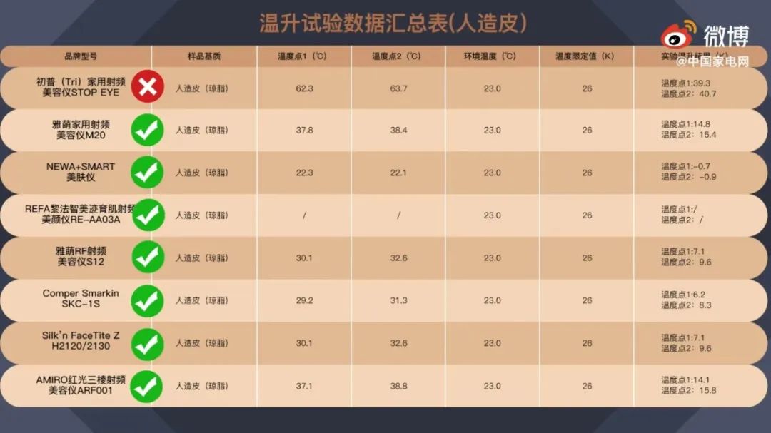 去年315国际消费者维权日,中国家电网与中国检验检疫科学研究院联合开展了“家用美容仪比较试验”,对市面上的8款射频美容仪进行了温度、电器安全等方面的检测。其中,初普美容仪TriPollar Stop EYE测试不达标,在使用时温度最高超过60℃,完全超出人体承受温度,存在很大程度的烫伤风险。