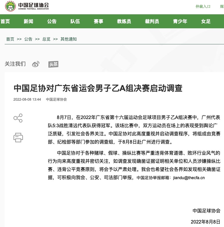 中国足球协会网站8月8日消息,8月7日,在2022年广东省第十六届运动会足球项目男子乙A组决赛中,广州代表队5:3战胜清远代表队获得冠军。该场比赛中,双方运动员在场上的表现受到舆论广泛质疑,引发社会各界关注。中国足协对此高度重视并启动调查程序,将组成由竞赛部、纪检部等部门参加的调查组,于8月8日赴广州进行调查。
