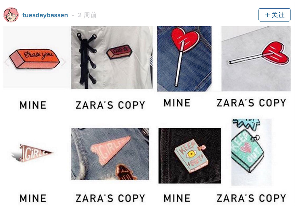在抄袭猖狂的时尚产业,Alexander Wang、Nicolas Ghesquière、Dries Van Noten等大牌设计师吃了不少苦头,处于弱势地位的年轻独立设计师更是如此。近来,至少有12位独立艺术家近来控诉快时尚品牌Zara盗用了自己的设计。当受害人之一的Tuesday Bassen通过律师与Zara交涉后,得到的答复激起民愤:你代理人声称的设计缺乏独特性,因此很难判断大多数人会如何将这些标志与她联系在一起——简言之就是:你不出名。