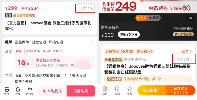 △图片来源:Joocyee酵色抖音官方店铺(左)/天猫官方旗舰店(右)