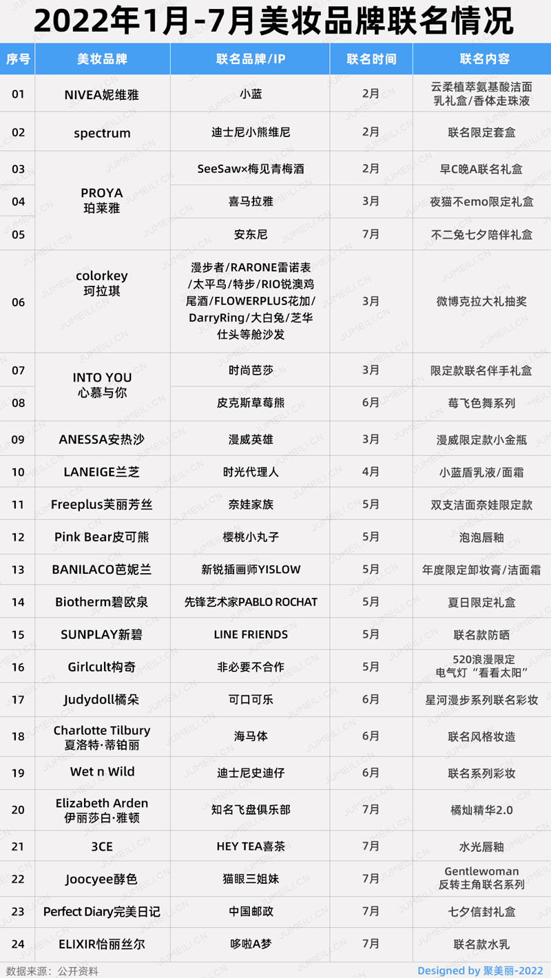 不过,从下方表格中可以看到,2022年1月-7月,美妆联名的数量并没有持续下降的趋势,且保持比较稳定的水平。