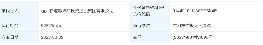 天眼查App显示,近日,恒驰汽车关联公司恒大新能源汽车投资控股集团有限公司新增被执行人信息,执行标的926万余元,执行法院为广东省广州市中级人民法院。目前,该公司被执行总金额已超1亿元。