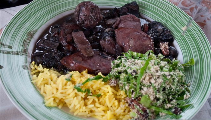 1.Feijoada::巴西的“豆饭”是当地的招牌菜,是将黑豆与各式各样的烟熏干肉以小火炖煮而成。起初做这道菜用的尽是厨房剩下不用的材料,然后给奴隶吃。如今,猪尾巴、猪耳朵、猪脚等都成了慢熬煨煮的材料。在里约热内卢,周末午餐吃Feijoada已成了当地人的习惯,全餐包括米饭、切得细碎的甘蓝、奶油树薯粉,和切片的柳橙等。