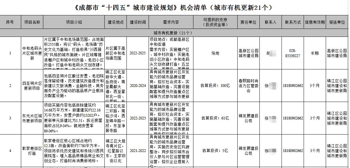 7月25日,《成都市“十四五”城市建设规划》机会清单正式发布!本次机会清单共60个项目,总投资约3721亿元。其中,包含中和老码头片区城市更新、四圣祠片区更新、东光片区城市更新在内的城市有机更新项目21个。