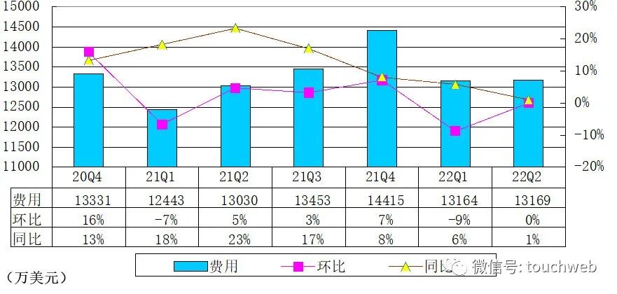 搜狐2022年第二季度费用为1.32亿美元,较2021年同期增长1%,与上季度持平;非美国通用会计准则营业费用为1.30亿美元,较2021年同期增长2%,与上季度持平。