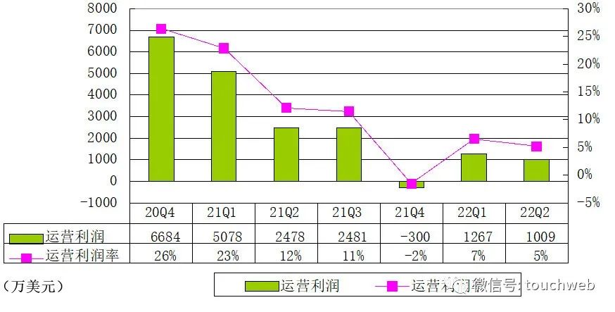 搜狐2022年第二季度美国通用会计准则营业利润为1000万美元,2021年同期营业利润为2500万美元,上季度营业利润为1300万美元。