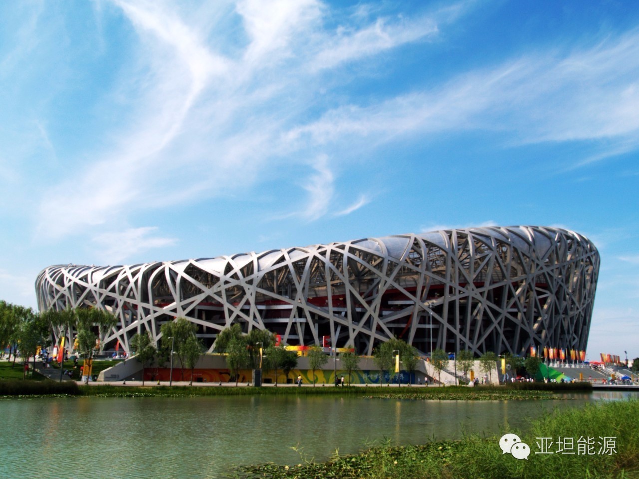在“鸟巢”的12个主通道上方,安装了总装机容量130千瓦的太阳能光伏发电系统。虽然整体装机量并不是很高,但是在2003年之前的设计规划中就已经将光伏发电运用到体育场的设计建设中,这在国内已经属于比较超前的运用,而鸟巢的太阳能光伏发电系统产生的电力将直接并入国家体育场的电力供应系统,对奥运场馆的电力供应起到良好的补充的作用。