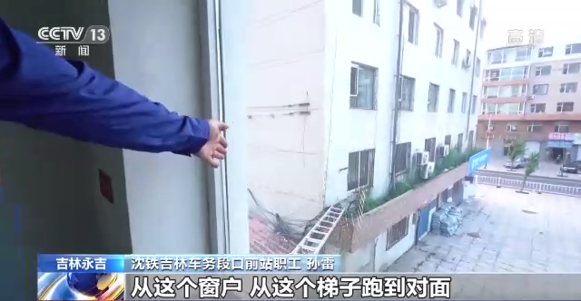 沈铁吉林车务段口前站职工 孙雷:从这个窗户,从这个梯子跑到对面。当时水流非常急,先过去的职工帮助后过去的职工转移到安全地点。