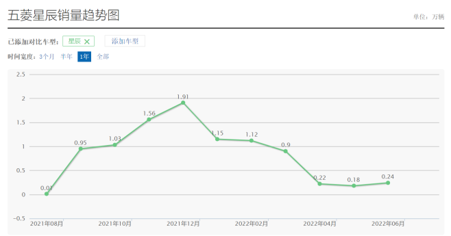 其第一款银标SUV五菱星辰开局不错,一度月销逼近2万辆,然而热度仅维系了数月,之后就高台跳水,到了2022年6月销量只剩下2429辆,在当月SUV销量中排名第98位。