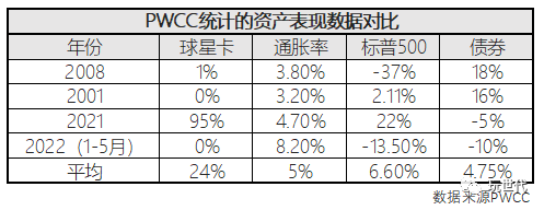 市场上不但有长线、短线投资之分,圈内也流行用金融投资视角来评估分析,比如球星卡交易平台PWCC曾发布多组回报率数据,对标基金、股市、黄金。