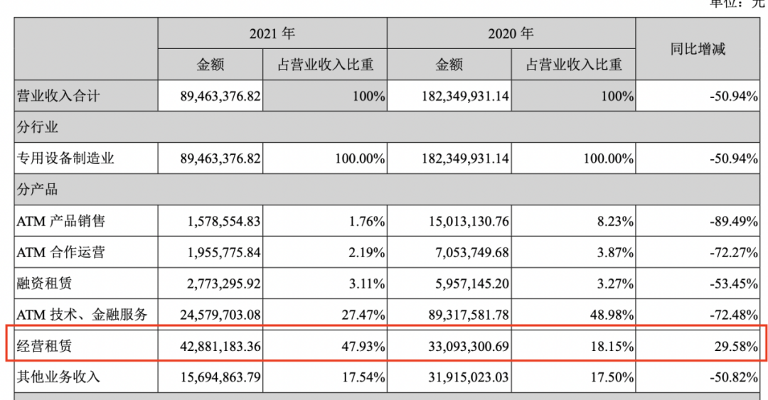 先看2021年业绩:全年营收8946万元,较上年同期下降50.94%,归属于上市公司股东的净利润亏损6176万元,较上年下降186.07%。营收的下降可以说是公司除经营租赁业务外,其余ATM产品销售、ATM合作运营和ATM技术、金融服务等业务均出现了大幅下降,可净利润的下降却是因为炒股巨亏超4700万元,占其当期净利润总额的95.32%,可谓是炒股败全年。
