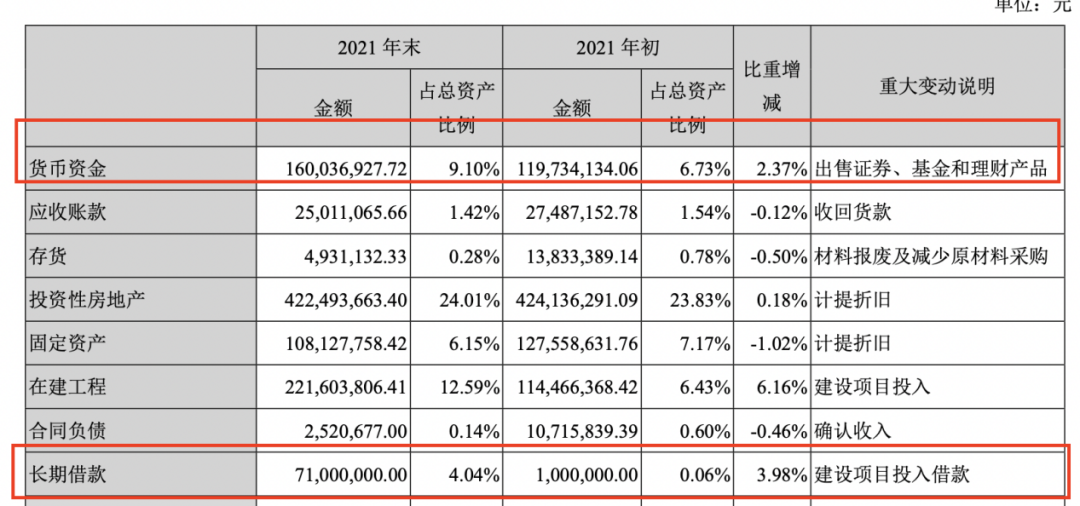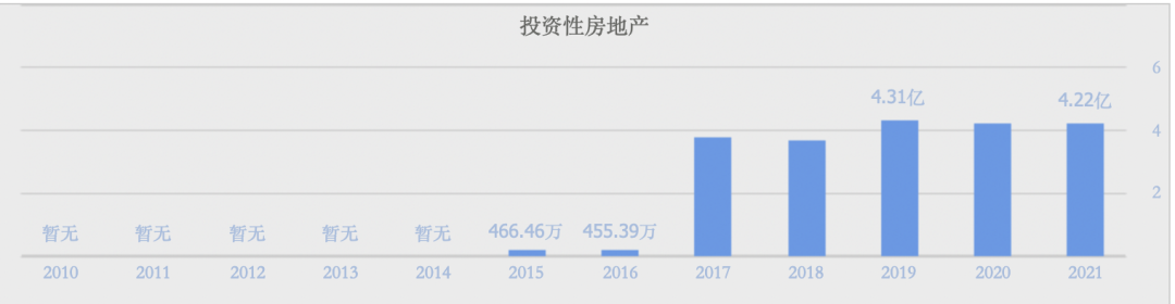 从2015年开始,御银股份便开始涉足房地产业务,不过在2016年之前,都是小打小闹,其持有的投资性房地产也仅仅才455万左右,然而,从2017年开始,其投资性房地产余额一下子暴增至3.76亿元,随后一路增至2021年年底的4.23亿元,较2015年增长了近10倍,而同期的货币现金余额却从201年的4.53亿元降至2021年的1.6亿元,两者的一增一减,完美的解释了其现金使用动向——进入房地产市场。