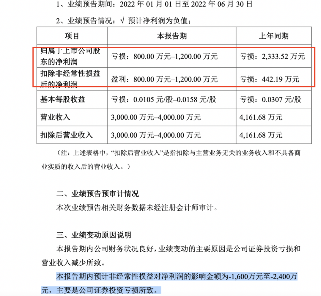 原以为御银股份会吃一堑长一智,没想到却越陷越深,其2022年半年报预告显示,归属上市公司股东的净利润为亏损800-1200万元,其中非经常损益对净利润的影响为-1600万元至-2400万元,主要是证券投资亏损所致。