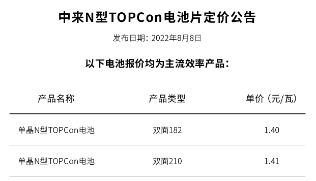 8月8日中来股份官网消息,N型TOPCon技术领军企业中来股份首次对外公布了其电池的价格数据。其中,单晶N型TOPCon电池(182双面系列)的报价为1.40元/瓦;单晶N型TOPCon电池(210双面系列)的报价为1.41元/瓦。