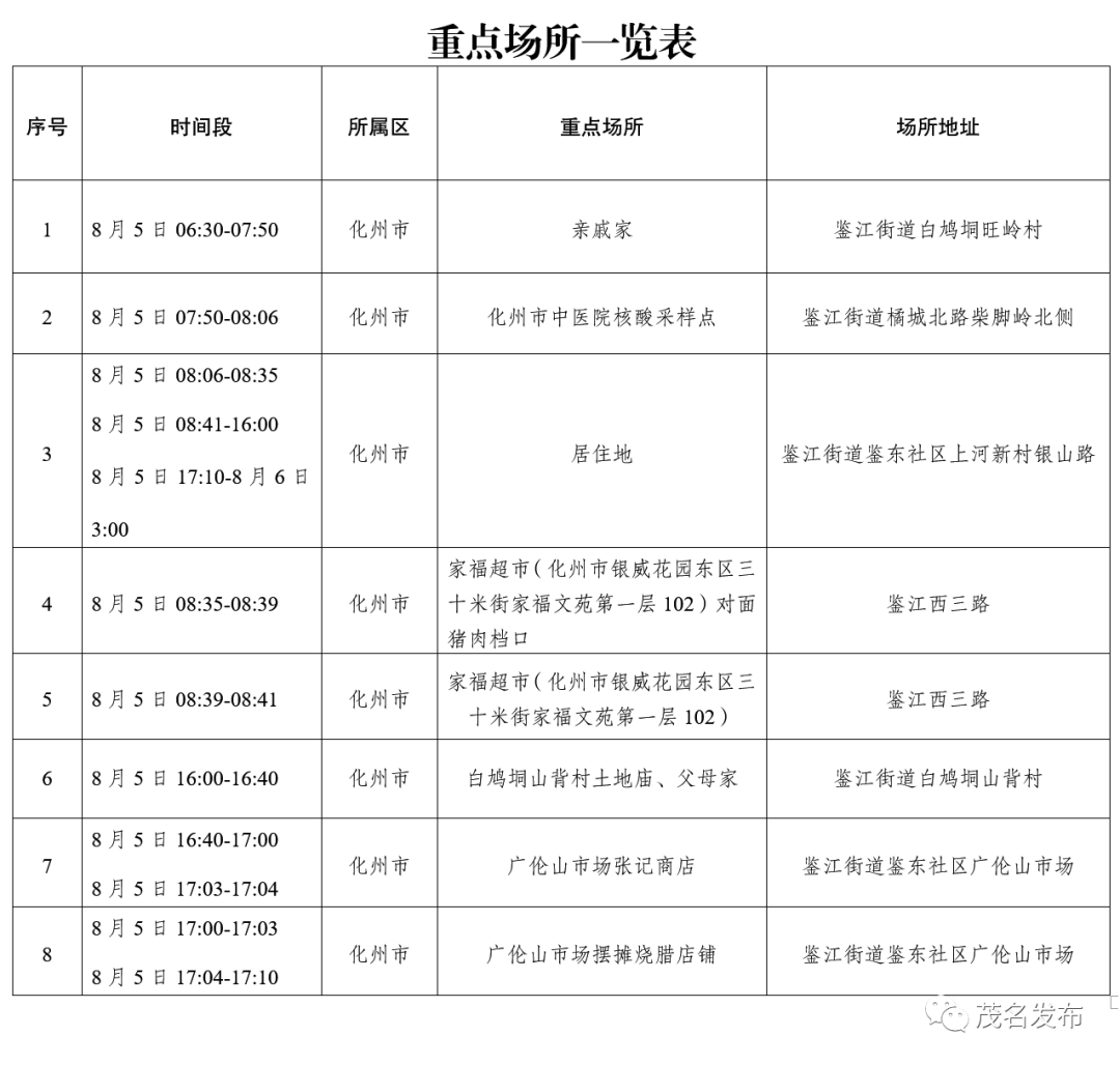 “茂名发布”微信公众号8月9日消息,8月8日0-24时,电白区新增6例阳性个案。此外,8月8日0时至12时,化州市新增1例阳性个案,在已集中隔离管控的密接人群中发现,为化州市8月6日通告的新冠肺炎确诊病例董某某的密切接触者。