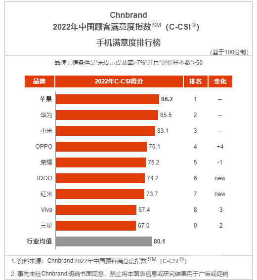 同时,通过调查数据显示,vivo的用户认可度并不高。近日,据中国领先的品牌评级与品牌顾问机构Chnbrand发布2022年中国顾客满意指数——手机满意排行榜显示,上榜的前九个手机品牌分别为苹果、华为、小米、OPPO、荣耀、iQOO、红米、vivo以及三星。其中vivo客户忠诚度只有67.4分,不及行业均值的80.1分,而较去年也下降了三个名次。
