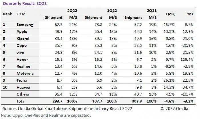 据市场调研机构Omdia透露,今年第二季度,全球智能手机市场中,三星共出货6220万部手机,引领市场,第二名则是苹果,而vivo排在第五位,被国内的小米、OPPO轻松碾压。而在2021年全年的智能手机出货量中,vivo则排名全球第四。