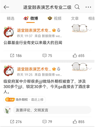 “公募基金行业有史以来最大的丑闻”、“很多基金经理做场外期权被查了,涉及300多位基金经理,锁定30多位”......昨日晚间,一个名为“退堂鼓表演艺术专业二级”的微博用户连续发了两条有关基金经理被查的消息,顿时将“基金经理”顶上热搜。
