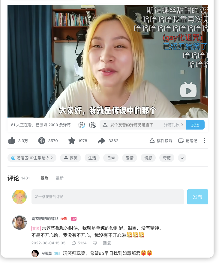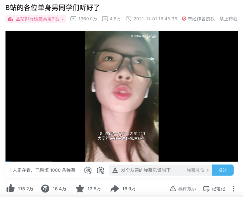 去年底,一个名为《B站的各位单身男同学们听好了》的视频在B站突然走红,一位研二女声对着镜头介绍自己的征恋视频,达到1300万+的播放量和近7万的评论数,不仅让B站的单身男同学们打起了精神,也带起了一波B站上的“求偶热”。
