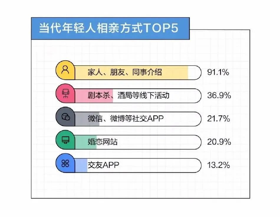 在《2022年轻人相亲报告》的当代年轻人相亲方式TOP5中,交友APP排名最后仅占13.2%,这几乎宣告了交友APP在年轻人视野里的消失,现在看来,似乎正是网络社区接过了这一棒,让“社区式相亲”成为了年轻人的新选择。