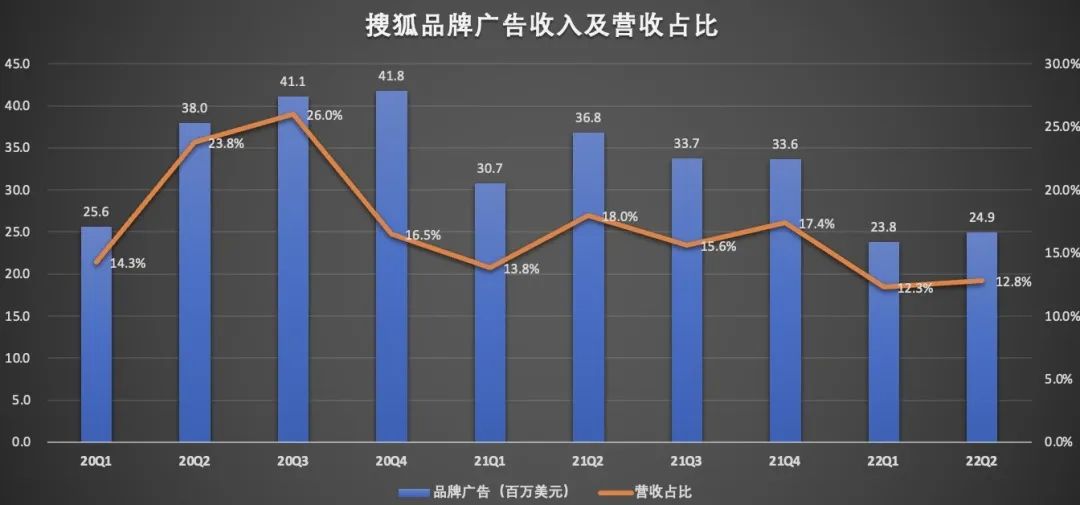 财报显示,2022年第二季度,搜狐品牌广告收入2500万美元,同比减少32%,该项收入已连续五个季度同比减少。报告期内,品牌广告收入在总收入中的占比为12.8%,低于上年同期的18%。搜狐广告业务下滑与经济疲软有直接关系。事实上,国内百度、腾讯等各大互联网公司的广告业务均受到不同程度地影响。
