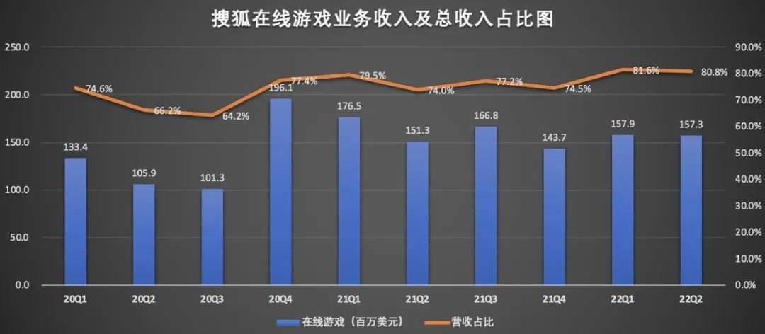 财报显示,2022年第二季度,搜狐在线游戏收入1.57亿美元,同比增长4%,环比减少0.4%,该项收入在总营收中的占比为80.8%,高于上年同期的74%。游戏业务中,搜狐高度依赖老款游戏《天龙八部》。