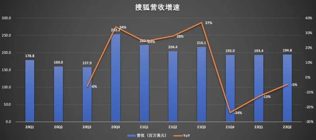 财报显示,搜狐公司2022年第二季度总收入为1.95亿美元,较上年同期的2.04亿美元,下滑5%,较上一季度的1.93亿美元,仅增长1%,需要提醒的是,搜狐公司已连续三个季度营收同比下滑。