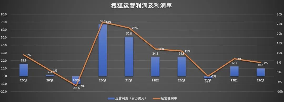 搜狐2022年第二季度美国通用会计准则营业利润为1000万美元,2021年同期营业利润为2500万美元,上季度营业利润为1300万美元。搜狐2022年第二季度非美国通用会计准则营业利润为1100万美元,2021年同期营业利润为2800万美元,上季度营业利润为1400万美元。