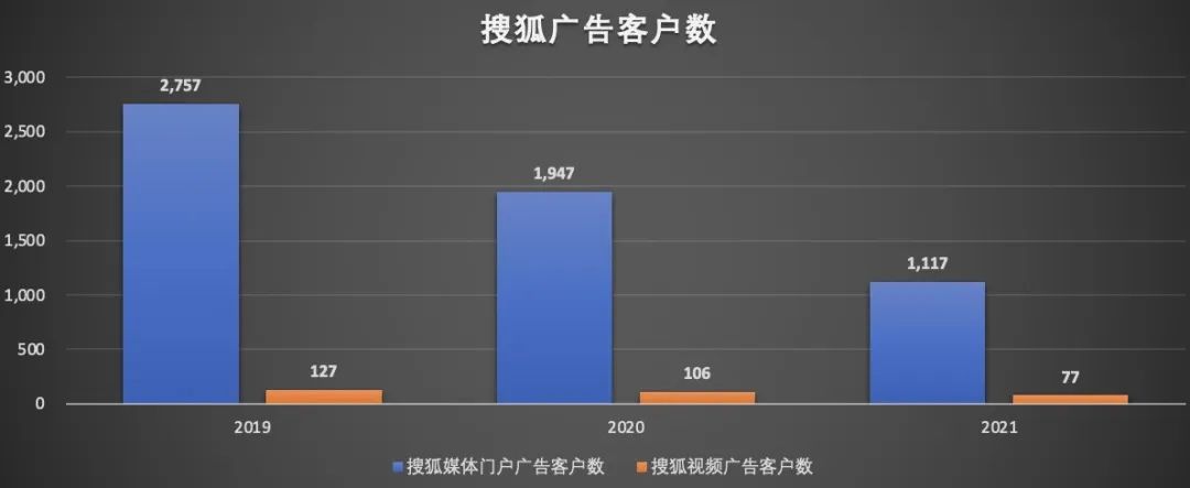 2021年搜狐媒体门户广告客户数为1117,较2020年的1947减少43%,较2019年的2757减少59%;2021年搜狐视频广告客户数为77,较2020年的106减少27%,较2019年的127减少39%。