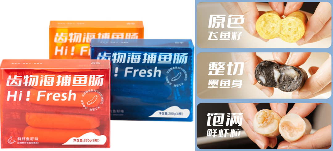 多样的原料添加造就出各式各样的新奇口味,芝士、小龙虾、墨鱼……只有你想不到,没有它们做不到。曾经被视为上流产品的鱼籽如今也成为肠的“内容物”,用“隐蔽”的方式继续向人们展示着它的优雅与迷人。齿物的海捕鱼肠很具有代表性,主要专注于新鲜和无添加,除了含有鱼籽、墨鱼外,整颗鲜虾添加也是其一大特色。