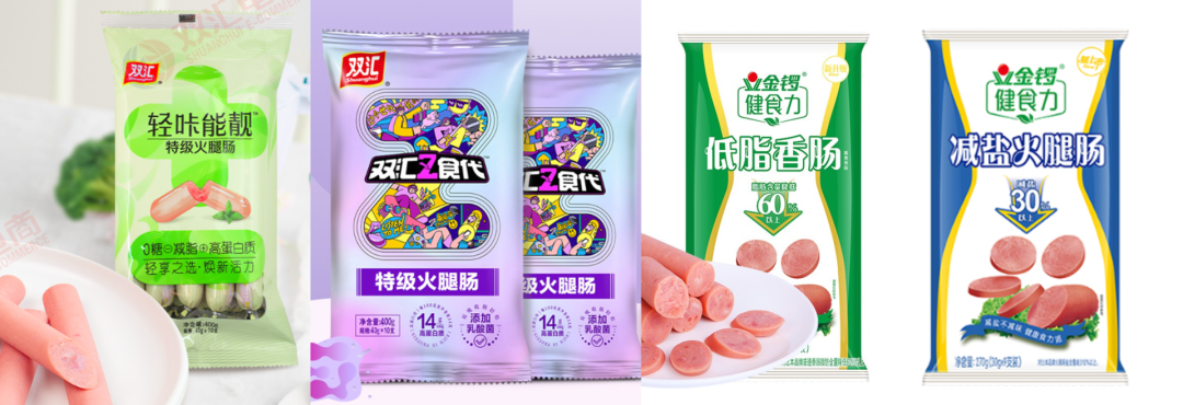 食品行业掀起的减糖减盐减脂浪潮,让火腿肠品牌倍感“瘦身”压力,纷纷做起减法。双汇、金锣等头部品牌身先士卒,推出轻咔能靓、Z食代、低脂香肠、减盐火腿肠等主打健康概念的产品。其中,双汇的轻咔能靓特级火腿肠定位无糖、减脂、蛋白质,减少热量摄入的同时兼具零食口感;而Z食代这款产品更是别出心裁,用乳酸菌彻底颠覆了人们对火腿肠的印象。据天猫旗舰店产品详情页显示,该产品每100g乳酸菌添加量不少于1x10的6次方CFU,蛋白质含量高达14g/100g。包装也焕然一新,炫酷的渐变紫加插画风无时无刻不在彰显着“潮”气息。