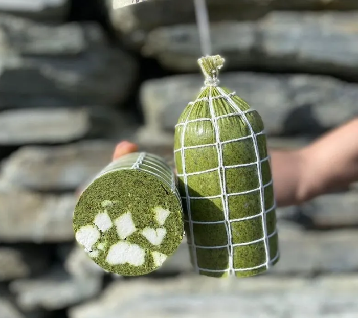 总部位于新西兰奥克兰的初创公司NewFish2022年推出一款纯植物基的熟香肠Ocean Mortadella。它由各种海藻制成,尤以烟熏发酵的新西兰裙带菜和牛海藻为特色,鲜亮的绿色香肠填充着植物基脂肪和微藻蛋白组成的脂肪块,极具视觉冲击力。如果要用一个词形容,那就是“抓马”,难以置信中又透露着丝丝的“浮夸”。