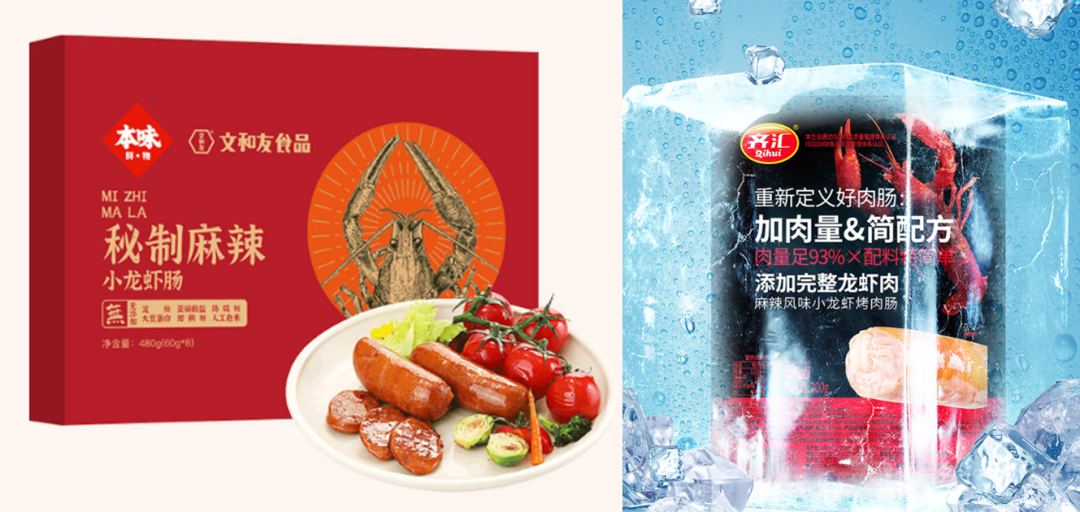 既然鲜虾可以加入,年轻人们都喜欢的小龙虾自然不会缺席,本味鲜物与文和友食品联名推出的蜜汁麻辣小龙虾肠、齐汇食品的小龙虾烤肠的小龙虾肉含量都达到10%以上,口味上各有千秋。