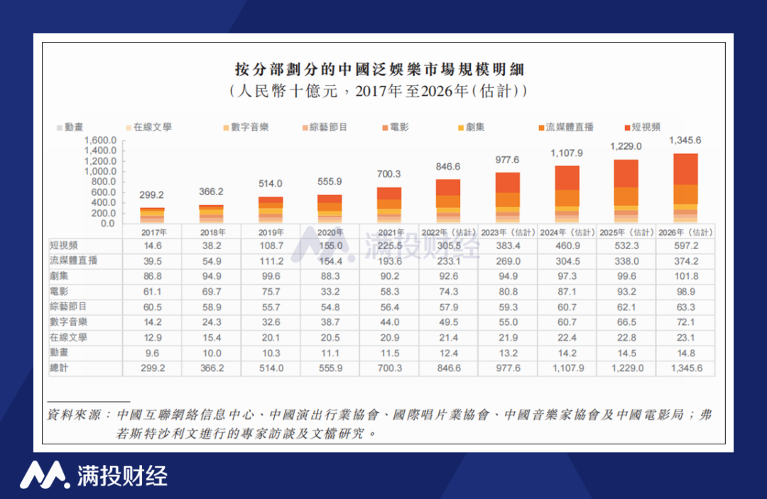 受中国城镇居民文化娱乐内容人均支出增长的推动,中国的泛娱乐市场于过往数年快速增长。根据弗若斯特沙利文,中国泛娱乐市场规模由2017年的2,992亿元增加至2021年7,003亿元,2017年至2021年的复合年增长率为23.7%。预期总市场规模将于2026年达至约人民币13,456亿元,2021年至2026年的复合年增长率为14.0%。