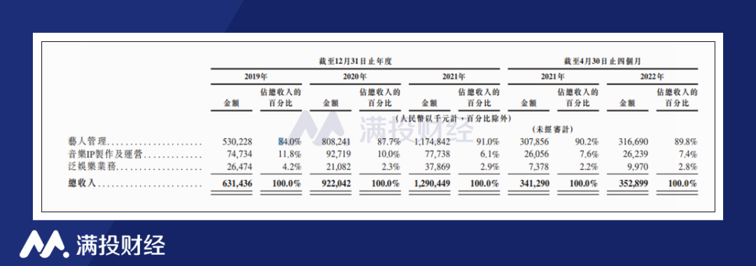 拆分公司的收入结构,乐华娱乐的收入来自艺人管理、音乐IP制作及运营、泛娱乐业务。其中艺人管理业务是公司的拳头业务,该业务主要是通过签约艺人参与商业活动,例如代言、商业宣传活动及其他商业活动;提供娱乐内容服务,例如出演电影、剧集及综艺节目,为包括企业客户、媒体平台、内容制作商及广告传媒公司在内的客户提供服务来产生收入。公司艺人管理的收入占比在80%以上,2020年之后比例进一步提升。