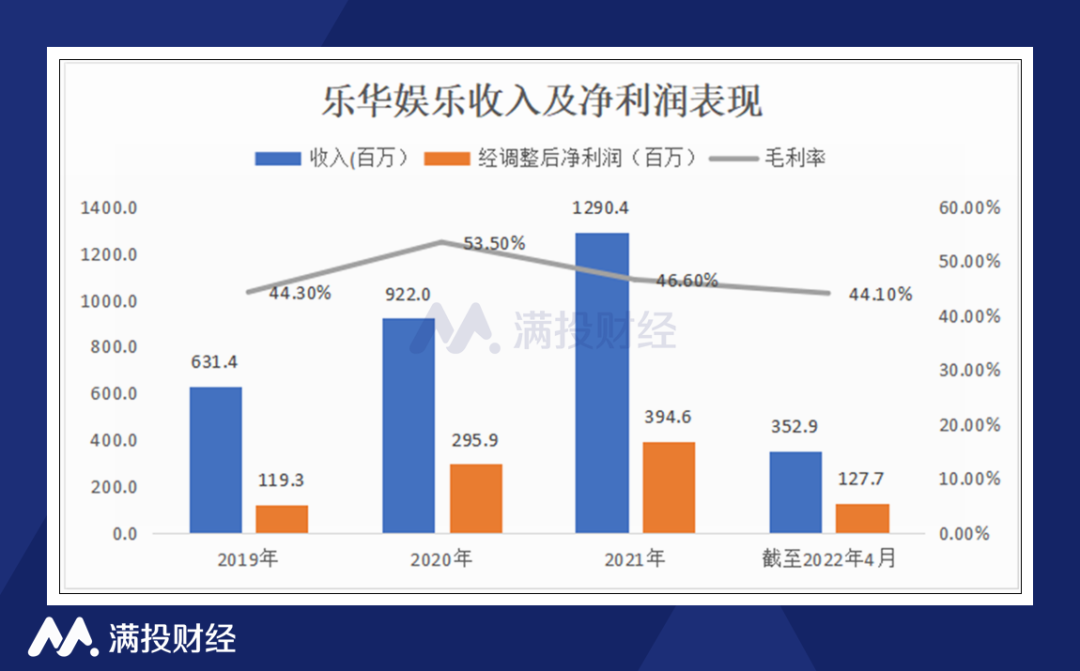 从收入来看,乐华娱乐近三年的营收分别为6.31亿元、9.22亿元和12.90亿元,公司收入呈稳定的上升趋势,即便是在疫情较为严重的2020年,也没有对公司的财务业绩以及运营造成重大不利的影响,2020年和2021年的收入增速高达46%和40%。然而2022年以来,国内多点爆发疫情导致公司的五个已获项目被取消,28个项目被推迟,导致延迟收款,2022年新获合同数目也有所减少。截至2022年4月,公司实现收入3.5亿元,较2021年同期的3.4亿元没有明显的增长。
