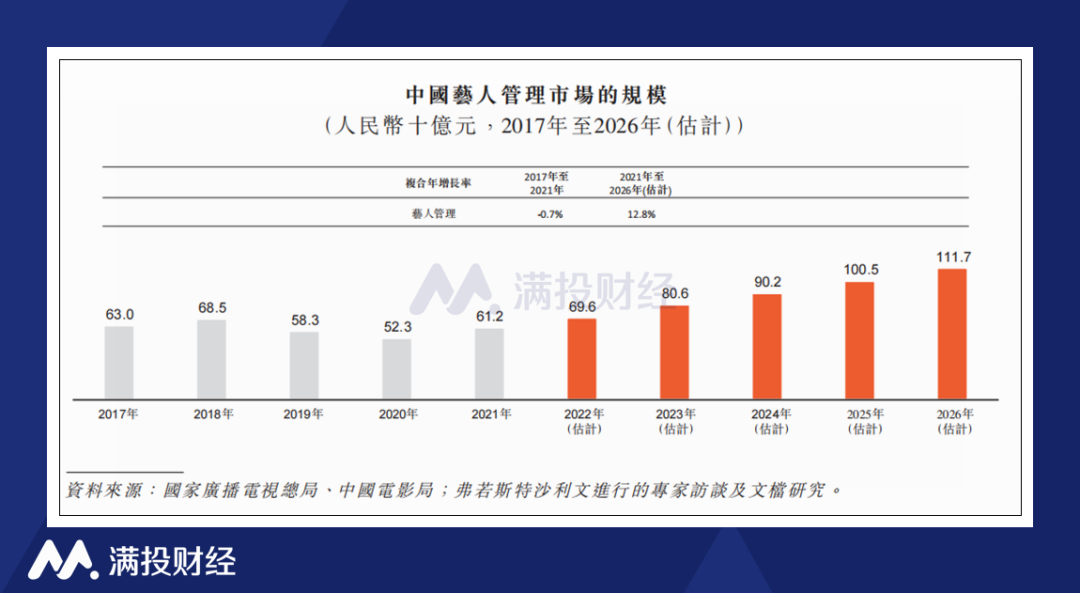 根据弗若斯特沙利文数据,得益于专业艺人管理系统的发展、争夺受众的数字渠道的激增以及多样化的变现渠道,预计未来中国艺人管理的市场规模将呈增长趋势,2026年达至约人民币1,117 亿元,2021年至2026年的复合年增长率为12.8%。