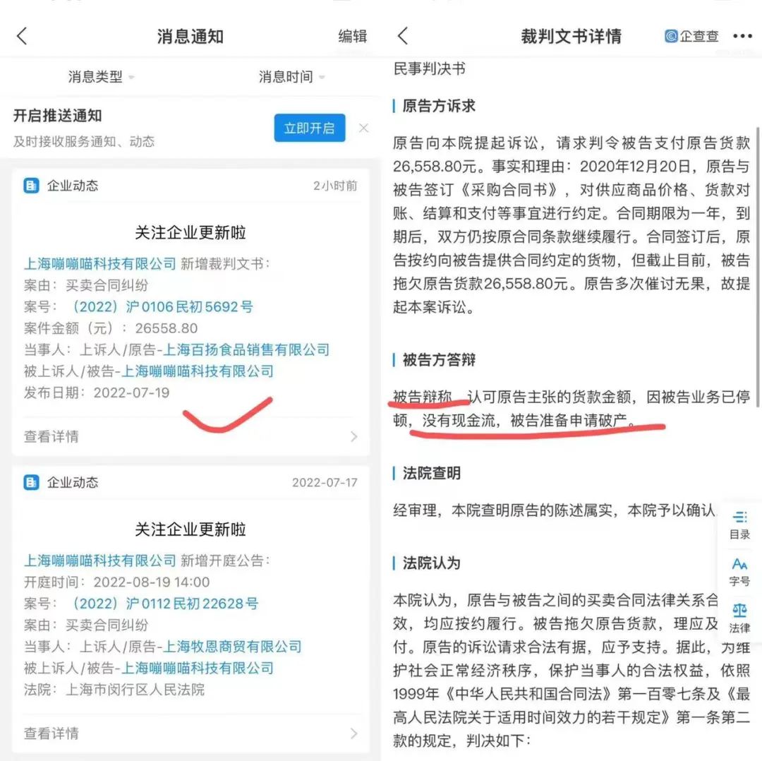 与此同时,企查查显示,2022年以来,繁荣集市的运营主体公司上海蹦蹦喵科技有限公司作为被告,官司纠纷不断。驼鹿新消费经梳理发现,这些官司大多是买卖合同和特许经营合同纠纷,这意味着繁荣集市的正常经营面临巨大的危机。此外,驼鹿新消费还在中国裁判文书网于2022年7月19日披露的判决书中发现,繁荣集市作为被告方在答辩时表示,业务已停顿,没有现金流,准备申请破产。