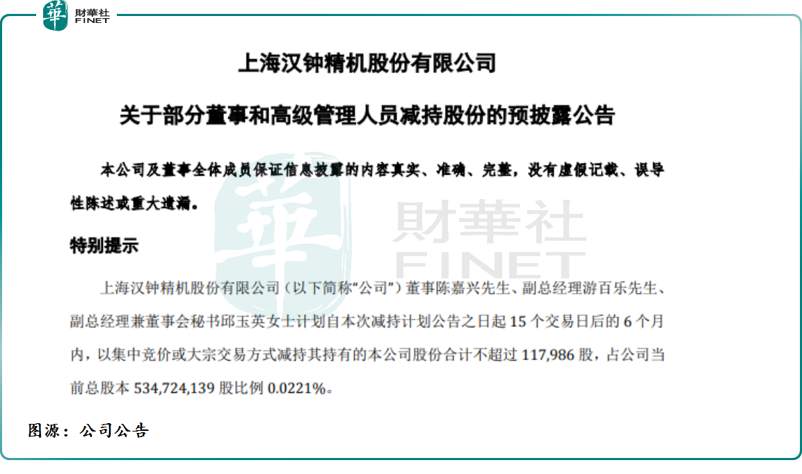 7月29日,汉钟精机发布公告称,公司董事陈嘉兴先生、副总经理游百乐先生、副总经理兼董事会秘书邱玉英女士计划自本次减持计划公告之日起15个交易日后的6个月内,以集中竞价或大宗交易方式减持其持有的公司股份合计不超过11.798万股,占公司当前总股本比例0.0221%。