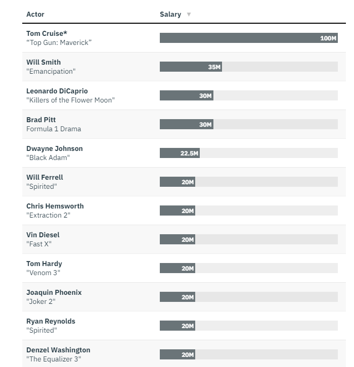 好莱坞最新片酬榜,汤姆·克鲁斯凭借《壮志凌云2》的1亿美元登顶