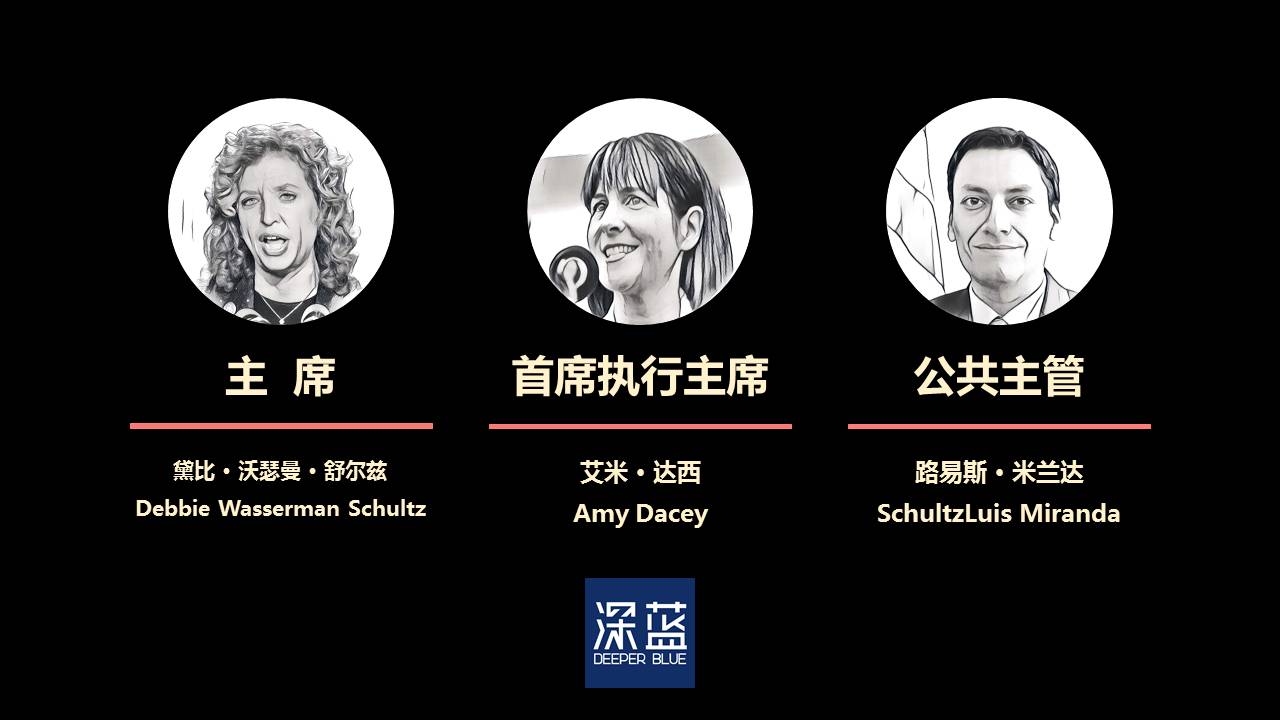 邮件泄露后后,民主党高层地震,主席黛比 · 沃瑟曼 · 舒尔兹(Debbie Wasserman Schultz), 首席执行长艾米 · 达西(Amy Dacey)和公共主管路易斯 · 米兰达(Luis Miranda)相继引咎辞职。(深蓝制图)