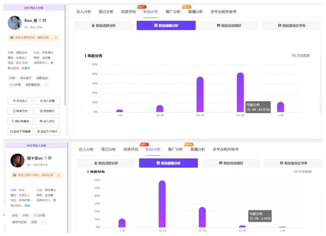 以40岁安妮姐姐与Roo_若为例,这2位博主在35-44岁的人群占比约为40%,而骆王宇和程十安这2位美妆头部博主,该人群占比仅为个位数。