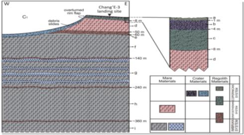 据“玉兔号”研发人员杨蔚、张金海和胡森2015年4月撰文表示,“玉兔号”实测了着陆区的月壤结构和厚度。月壤具有分层结构,其顶部分层厚约0.7米,质地均匀,几乎不含石块,而底界有一定的起伏,平均厚度约5米。