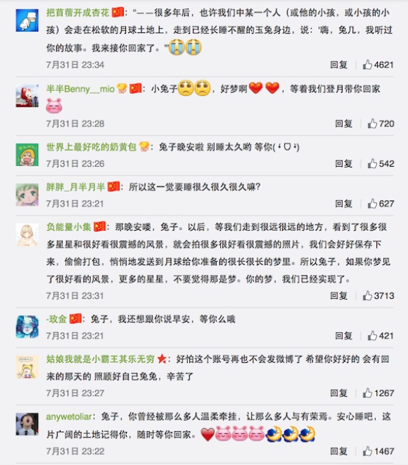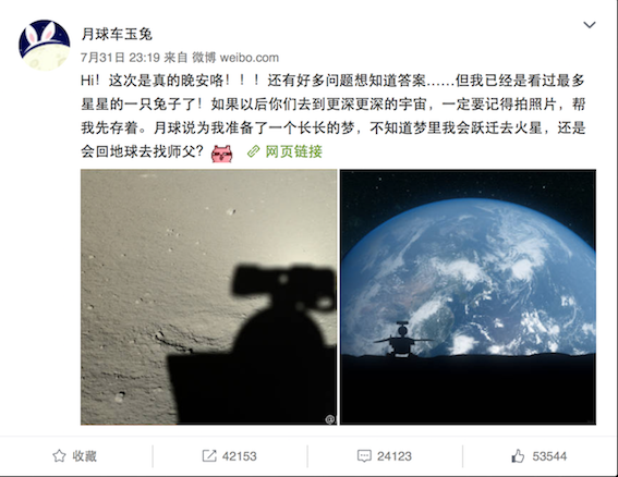 自2013年12月2日开通官方微博“月球车玉兔”以来,这只“兔子”凭借着第一人称口吻、杀伤力极大的卖萌招数与频繁的网络互动,成功地在两年时间内把自己打造成了一个航空领域的“网红”。截至8月5日上午,“玉兔号”的官博粉丝数61万,那条告别微博获得了4.2万次转发、5.4万次点赞和2.4万条评论。界面新闻记者发现,在“兔子”发布的总计347条微博中,就连2013年12月2日发布的第一条微博也布满了网友今日的热忱感激与思念。