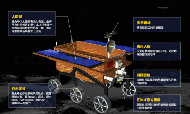 “玉兔号”整体呈长方形盒状,设计质量为140公斤,长1.5米,宽1米,高1.1米,行进速度200米/时。它由九个分系统组成:移动分系统、结构与机构分系统、制导导航与控制分系统(GNC分系统)、综合电子分系统、电源分系统、热控分系统、遥操作分系统、测控数传分系统、有效载荷分系统。