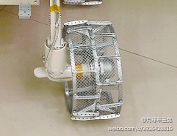 这种轮子叫“筛网轮”,由轮毂、钛合金编织筛网和耐磨的铝基复合材料棘爪等组成,直径300毫米,宽度150毫米,重量仅735克。这种轮子的制作工艺极其复杂,轮面的筛网由0.6毫米的钛合金丝编织而成,且每个网孔均匀整齐。筛网轮较大的接触面积和摩擦系数可避免“玉兔号”打滑或下陷,能保证其一边移动一边漏沙。此外,筛网轮上的间断性锯齿结构叫做“棘爪”,能极大提高轮子的抓地能力。