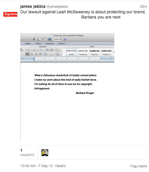 “Supreme Bitch”事件过后,Barbara Kruger首次对媒体公开表态,她在写给Complex的邮件中说:“真他妈是一场闹剧,我的作品本来就是关于这种可怜又愚蠢的举动,我等着他们,等着他们有天一起到法院告我侵权!”。幽默的是,Barbara Kruger写下这段话所使用的字体,正是Futura Heavy Oblique 无衬线字体。更令人啼笑皆非的闹剧接踵而来,Twitter上一个名为“James Jebbia”的账号转载了Barbara Kruger的表态,并写到:“我们和Leah McSweeney的官司是为了保护我们的品牌,接下来就轮到和你了”。不过随后James Jebbia对此予以否认,称该账号并非自己所开。