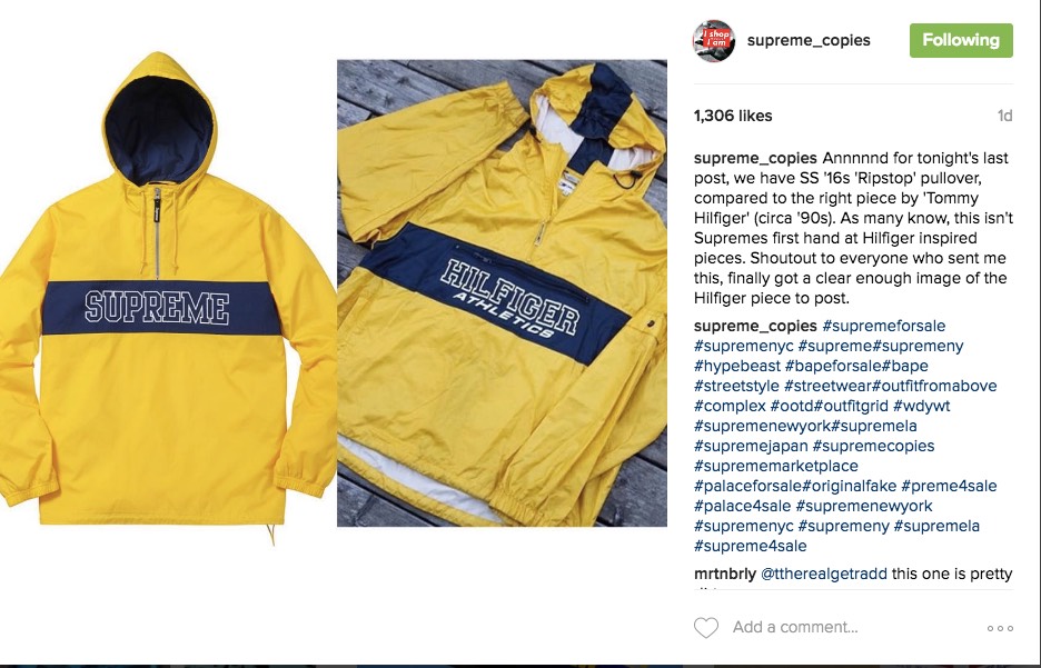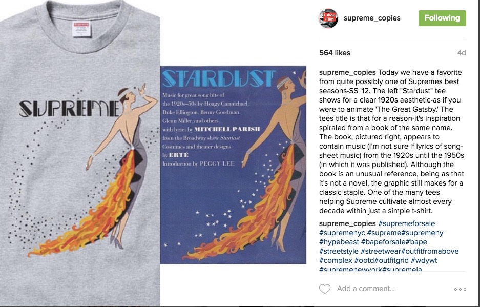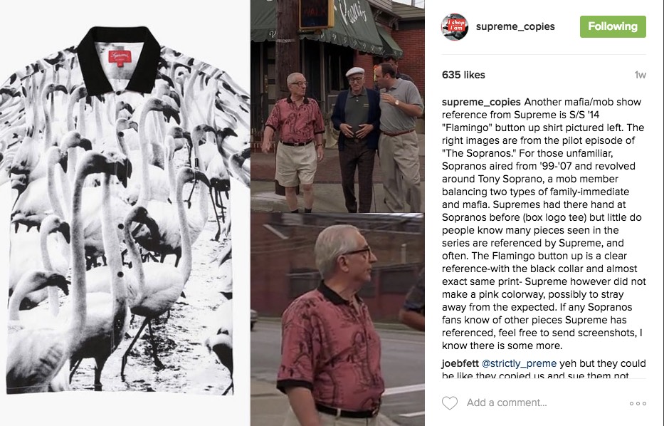 街头风格服饰的流行,同样再度引起关于“借鉴”和“抄袭”之间的讨论,特别是相关品牌的美学理论中,向来视此为对某种文化标签的致敬。名为“supreme_copies”的Instagram账号,一一列举了过往年间的Supreme单品的原始出处,从中可以发现该品牌的借鉴素材途径是如何广泛且不同寻常:包括杂志内页、古董广告、其他品牌生产的户外服饰到电视剧中的角色戏服无奇不有。其中一些完全不存在二度创作的痕迹,Supreme和原作的唯一的区别只有Logo。对此,作为Supreme狂热爱好者的“supreme_copies”账号作者则对Dazed说:“Supreme不欠他们(原作者)什么,很多都是出于对原作者的敬意,这也是街头风格的根基之一”。