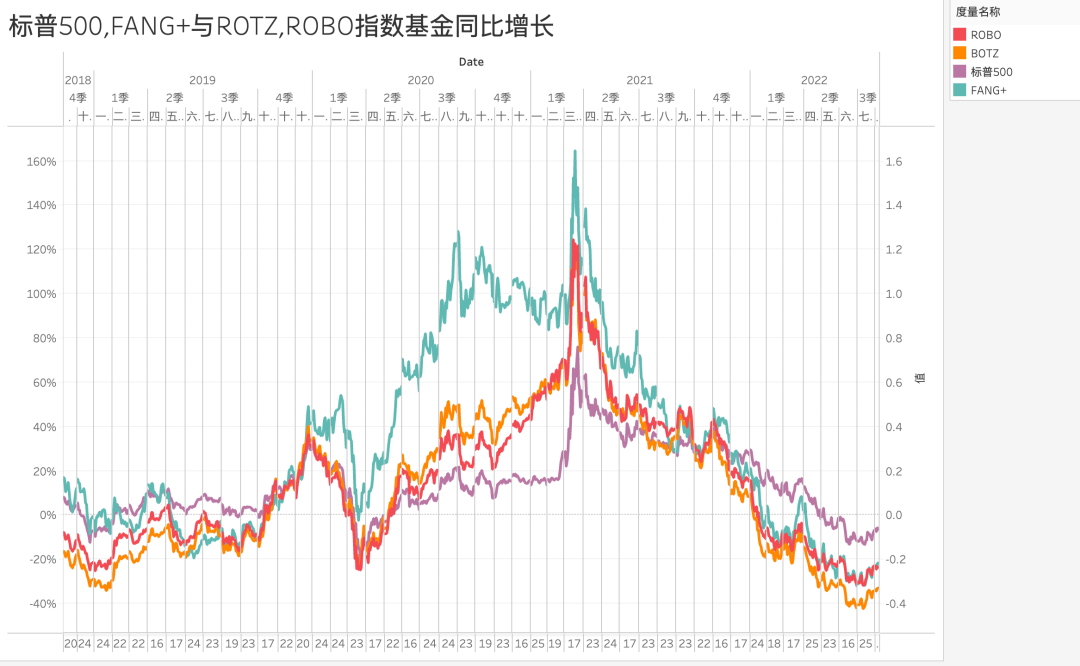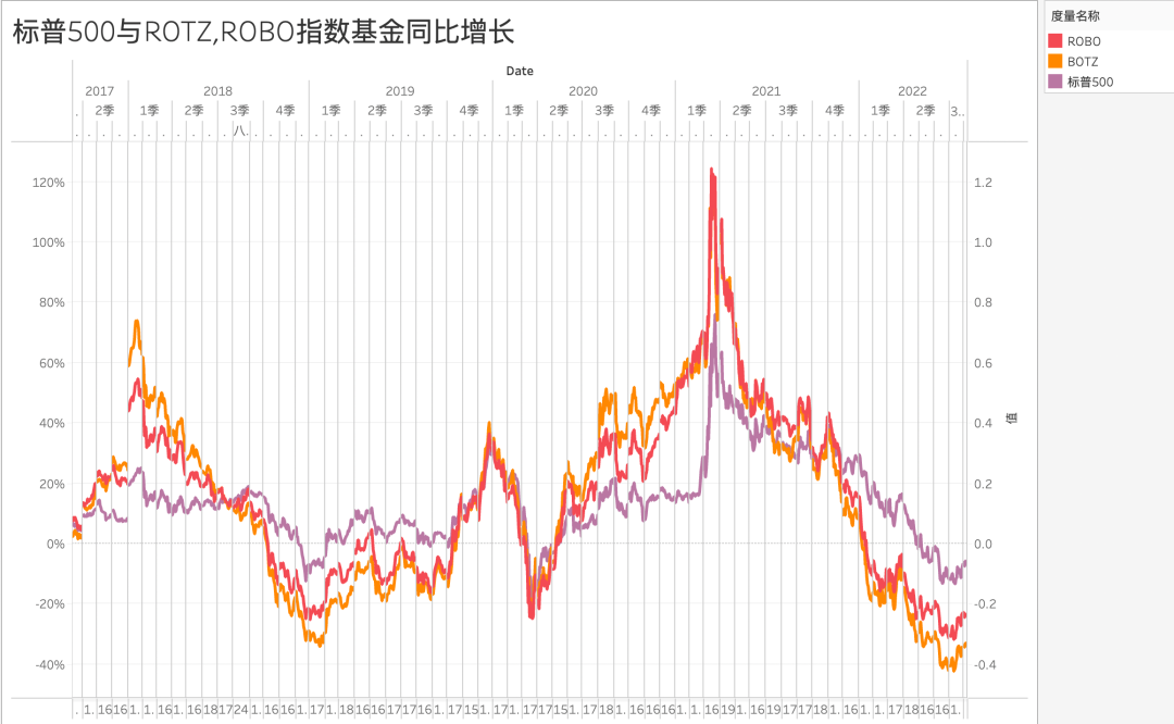 若我们武断推论机器人为“蓝海”时,看到上图大概会吃惊许多。作为一个所谓的“蓝海”行业,缘何在大多数时间都跑不赢标普500?在美联储放水刺激后,机器人ETF并未旋即走高,而是一直躺平到第三季度才迅速拉起,在2021年第一季度增速达到峰值之后,增长动力旋即回撤,在2021年末同比增长开始跑输于标普500。